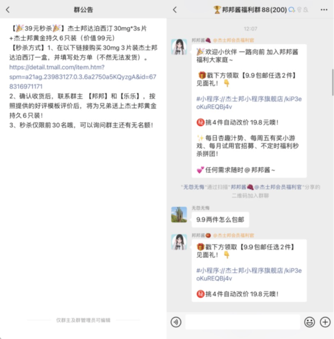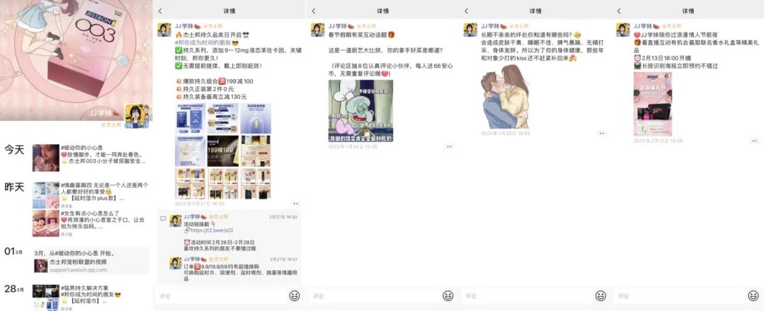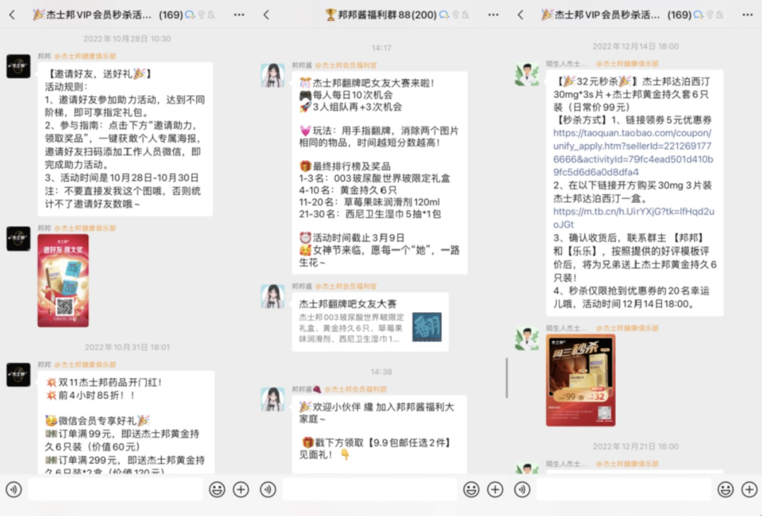 杰士邦社群每日會(huì)發(fā)布3-5條內(nèi)容,主要以秒殺活動(dòng)、互動(dòng)游戲、社群答疑、拉新好禮為主。