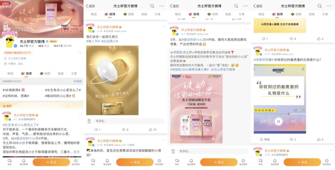 微博:杰士邦在微博有35.7w粉絲,主要內(nèi)容以話題互動(dòng)、產(chǎn)品種草、有獎(jiǎng)互動(dòng)為主。