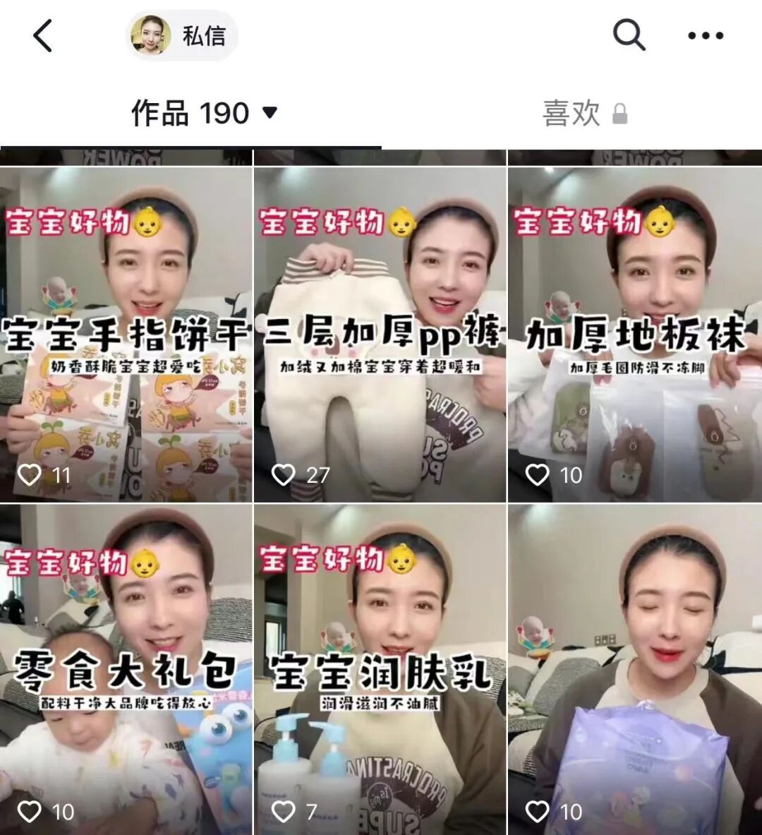 這個(gè)賬號(hào)的博主自己就是寶媽,然后賬號(hào)內(nèi)容就是很直接的分享母嬰好物,每個(gè)視頻都是商品。