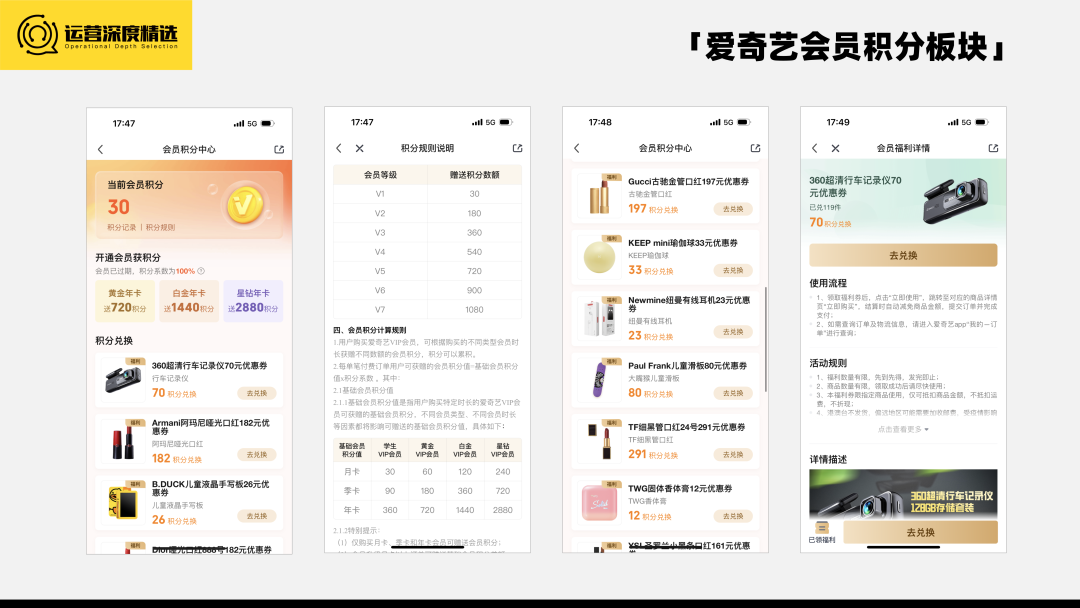 積分體系:愛奇藝會員的積分體系可謂簡單明了,直接和消費完全綁定。充值不同時長的會員可以獲得數(shù)量不等的積分,同時兌換出口暫時也只有商品優(yōu)惠券,沒有吸引力。
