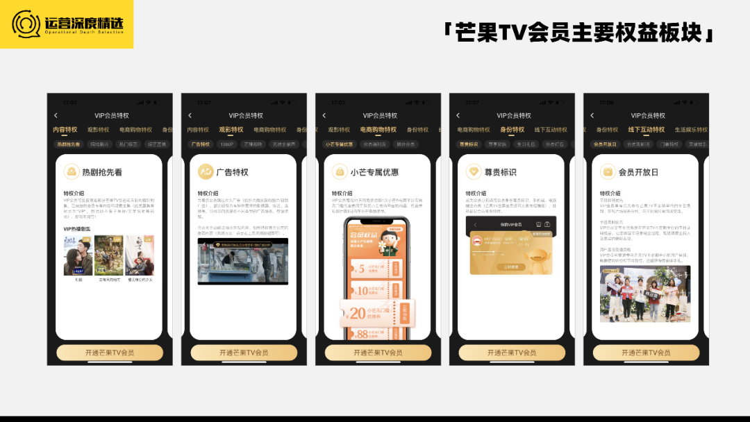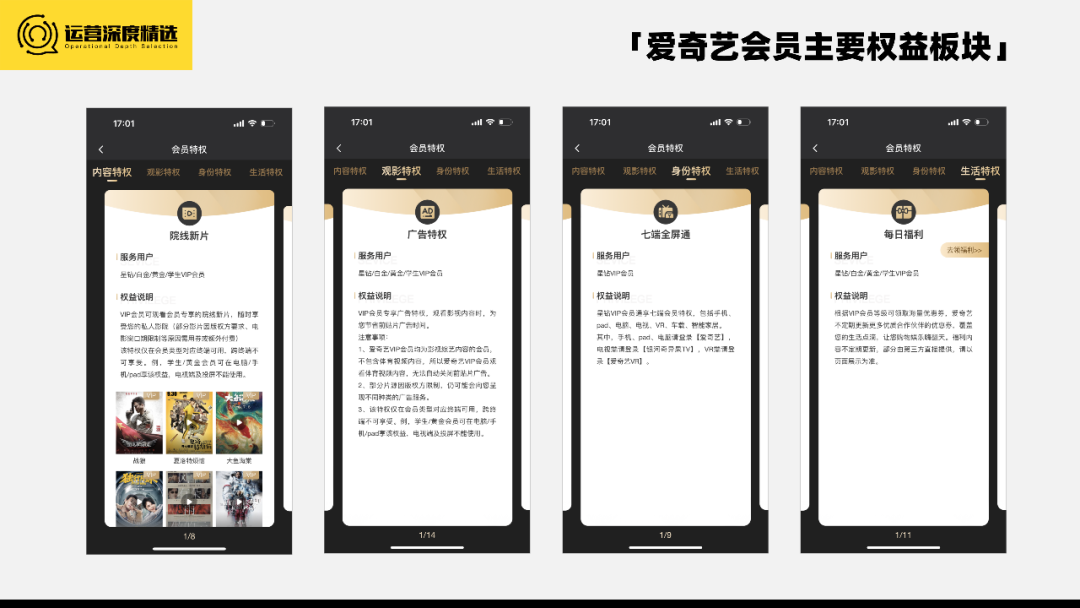再看基礎(chǔ)版會員對應(yīng)的權(quán)益,共分了8大板塊,包含內(nèi)容特權(quán)、觀影特權(quán)、電商特權(quán)、身份特權(quán)、線下互動特權(quán)等,在前幾者等基礎(chǔ)上做了更細分的權(quán)益劃分。