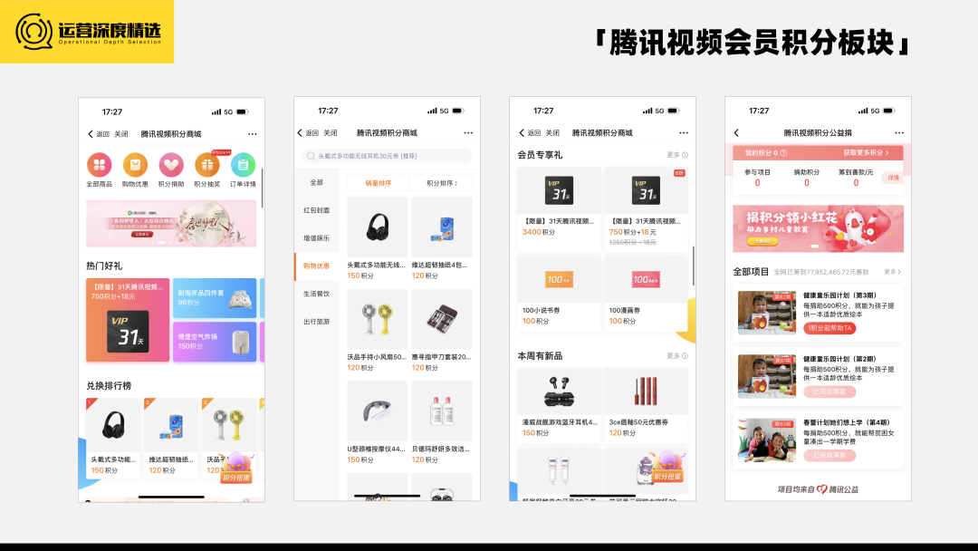 積分體系:騰訊視頻的積分體系,用戶可以通過觀看視頻、發(fā)表評論、分享活動等方式獲取積分,同時,騰訊視頻也設(shè)有積分商城,用戶可以用積分兌換虛擬道具和游戲道具等。值得一提的是,積分專區(qū)聯(lián)動騰訊公益做了“1積分起幫助TA”活動,同樣的案例我們在亞朵酒店案例中也見到過,是很拉好感度的積分消耗方式。