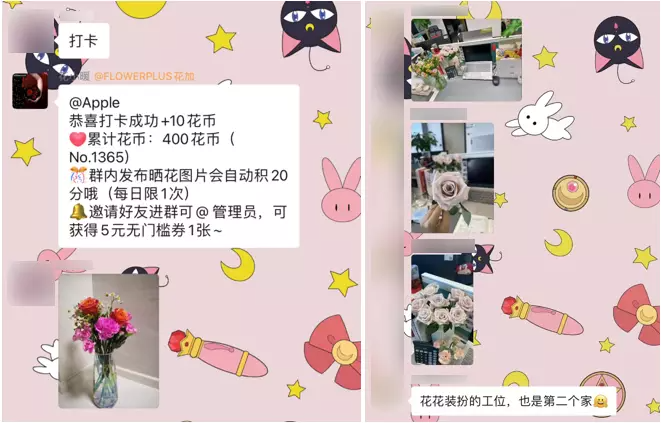 第一種是有強大消費能力的核心用戶,其訂閱鮮花的周期長達 6 個月以上,需要完善的售后服務,也有強烈的曬單分享欲。花加邀請他們進入專門的“優(yōu)質花友群”,滿足核心用戶曬花、交朋友的社交需求。同時群里還配有 7*24 小時的 VIP 客服,隨時解答核心用戶的售后疑問。