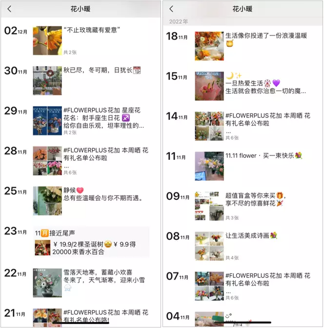 花加旗下有@花小藝、@花小暖、@花小葵 等多個名字與花相關的形象 IP ,他們在朋友圈里發(fā)布的內容多為養(yǎng)花的日常生活,用溫馨的文案配上精美的花朵圖片,打造“溫暖治愈”的品牌調性,極少出現(xiàn)直接賣貨的硬廣。