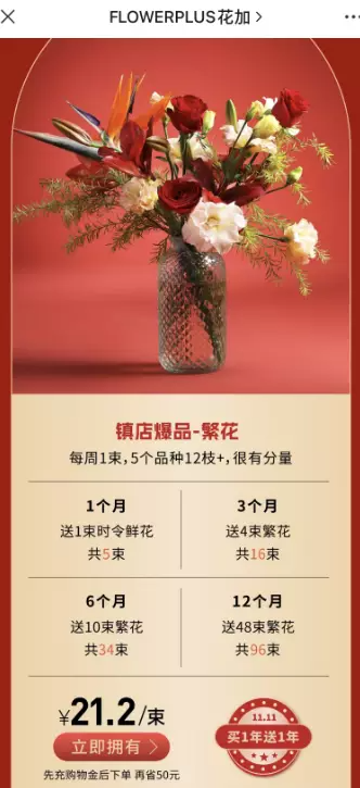 舉個例子,訂閱一整年的繁花,就可以再額外多送 48 束繁花,平均下來每束只要 21.2 元。這個價格就能被用戶所接受,降低消費門檻。
