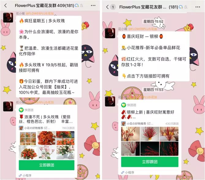 第二種是價格敏感型用戶。這一類用戶并沒有社交和售后需求的迫切需求,單純只想知道優(yōu)惠信息,想以更便宜的價格買到花。花加則將這類用戶邀請至專門的“優(yōu)惠通知群”,該群也起到達成銷售 KPI 的作用。