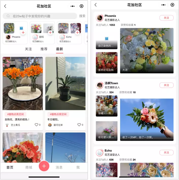 在花加的“曬圖社區(qū)”里,官方給予 KOL 靠前的資源位展示。如果積累了較多粉絲,花加也會跟 KOL 簽約,相當于是給予種草能力強的達人更豐富的激勵。