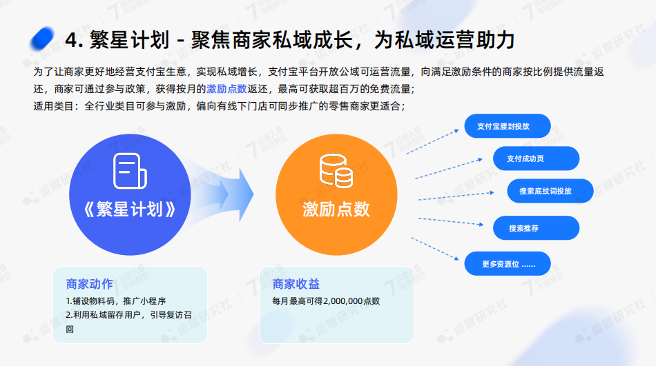 這些激勵會化成激勵點數(shù),這些激勵點數(shù)本身又可以被商家用來投放在支付寶的一些渠道中,比如說支付寶的一些腰封、成功支付頁面、搜索底紋詞、搜索推薦等,從而幫助商家獲得更多的流量。