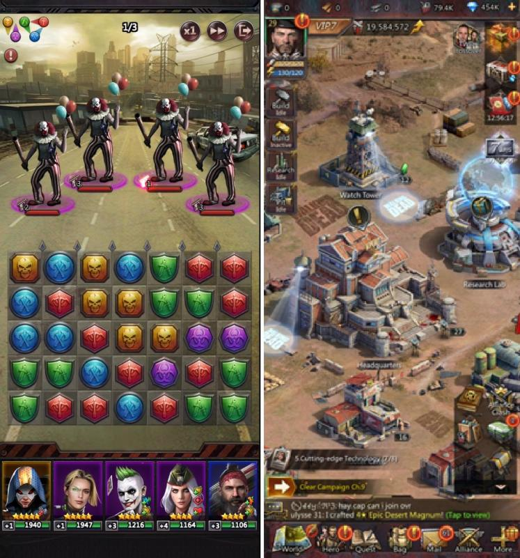 游戲玩法是,玩家通過消除三個相同的圖形來獲得武器,武器可以用來消滅僵尸。同時玩家可以選擇 5 位英雄,消除和英雄相同顏色的圖形后可以獲得能量,從而釋放英雄技能。