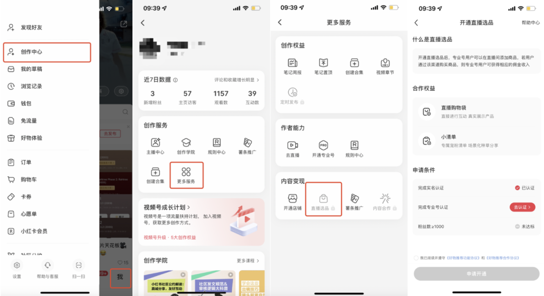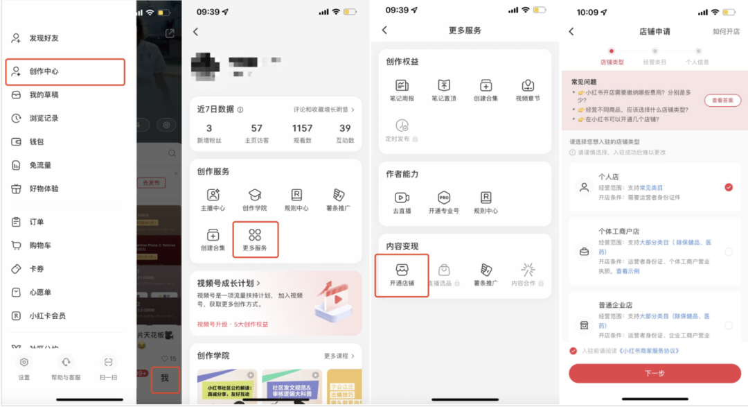 具體申請(qǐng)流程:【我的】—【創(chuàng)作中心】-【更多服務(wù)】-【開(kāi)通店鋪】-【店鋪申請(qǐng)】