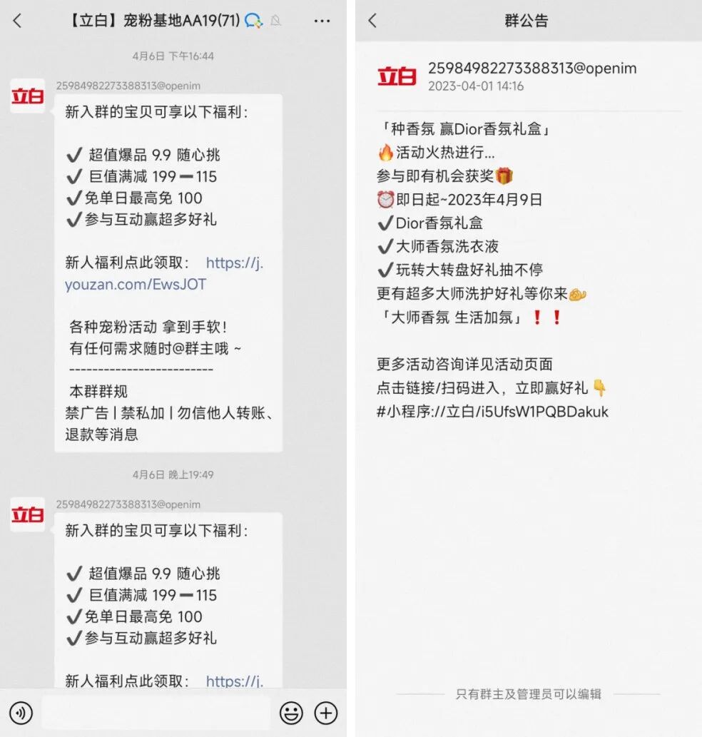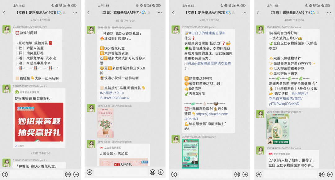 社群是私域中促活最有效也是最常見(jiàn)的場(chǎng)景,立白通過(guò)社群的運(yùn)營(yíng),增加產(chǎn)品的曝光和轉(zhuǎn)化。下面進(jìn)行詳細(xì)拆解:
