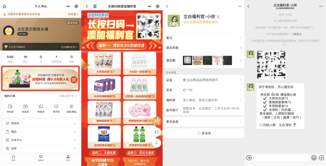 引流路徑(1):在【立白官方旗艦店】的個(gè)人中心,利用【加福利官得9.9元新人禮】的福利吸引用戶點(diǎn)擊,跳轉(zhuǎn)福利頁(yè)面,長(zhǎng)按即可掃碼添加企微,添加成功后自動(dòng)發(fā)送群二維碼。