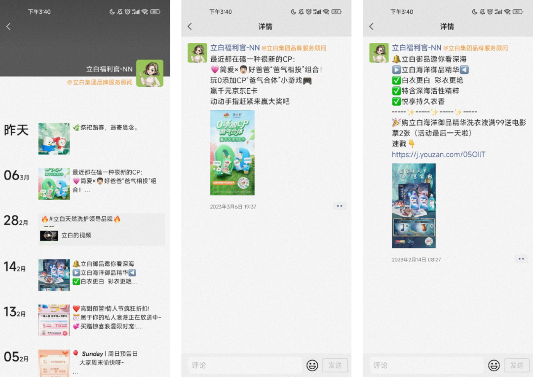 立白的社群內(nèi)容會(huì)進(jìn)行各類(lèi)游戲活動(dòng),發(fā)布產(chǎn)品種草轉(zhuǎn)化內(nèi)容,例如: