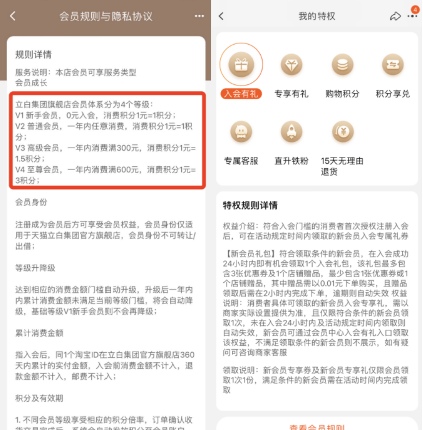 立白電商平臺(tái)的會(huì)員體系也很完善,主要以成長(zhǎng)會(huì)員+積分體系為主。