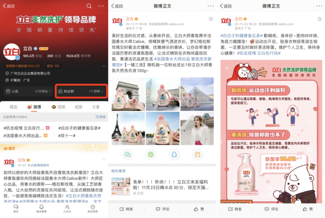 立白在微博有185.4萬(wàn)粉絲,主要內(nèi)容以話題互動(dòng)、產(chǎn)品種草、新品發(fā)布、有獎(jiǎng)互動(dòng)為主。