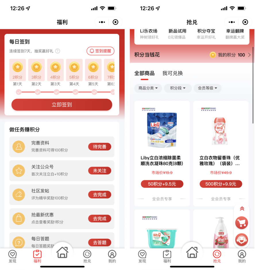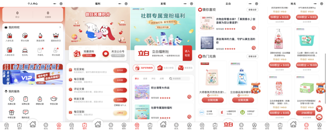 會(huì)員積分可通過(guò)簽到、答題、發(fā)帖、互動(dòng)等途徑獲取。積分可在積分商城中加現(xiàn)金換購(gòu),或免費(fèi)兌換洗衣凝珠、方巾、肥皂、洗衣液等產(chǎn)品。
