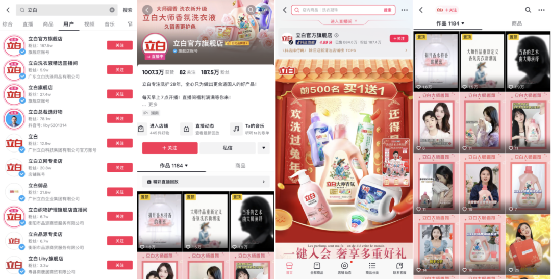 立白在抖音設(shè)置賬號(hào)矩陣,除主賬號(hào)【立白官方旗艦店】外,根據(jù)地域?yàn)闃?biāo)準(zhǔn)劃分不同的賬號(hào)。