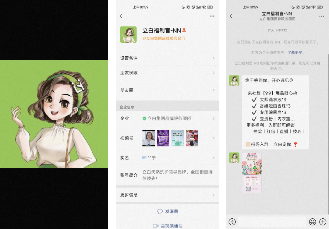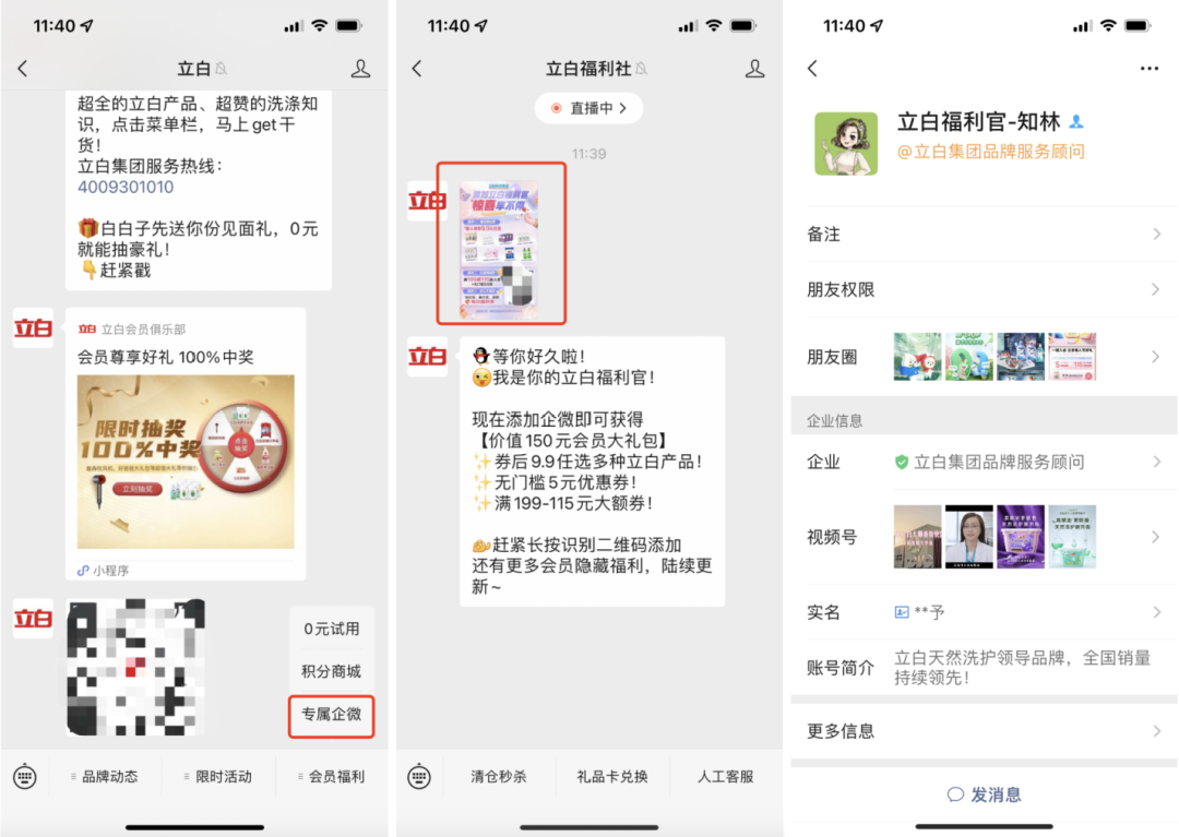 在公眾號(hào)「立白」的菜單欄中,有「專(zhuān)屬企微」的引流渠道,點(diǎn)擊可以直接添加企微福利官;在關(guān)注公眾號(hào)「立白福利社」后,會(huì)自動(dòng)發(fā)送福利海報(bào),附帶企微二維碼,引導(dǎo)用戶添加。
