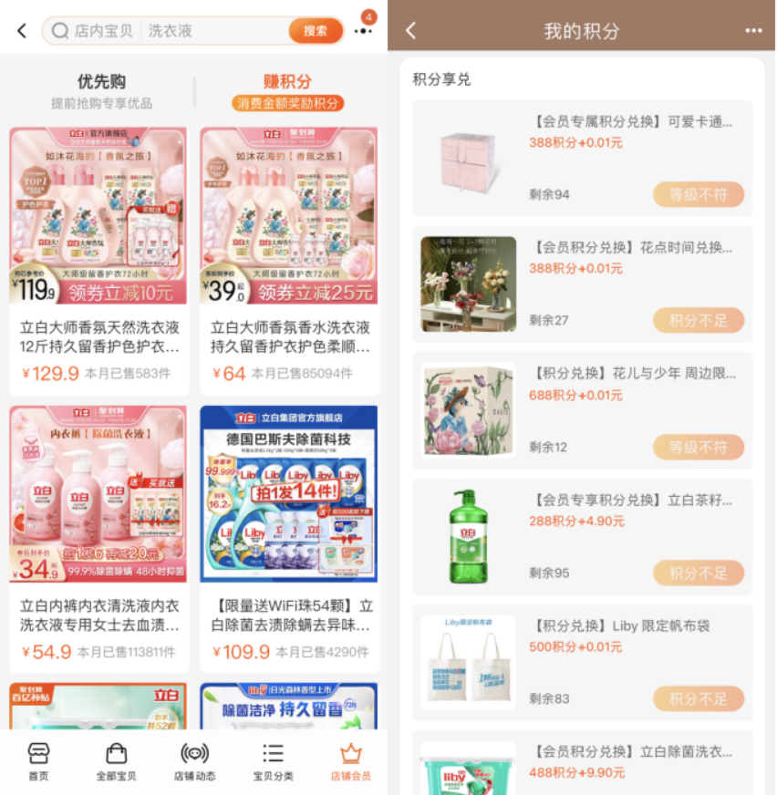 立白主要運(yùn)營(yíng)兩個(gè)小程序,分別是【立白官方旗艦店】和【立白會(huì)員俱樂(lè)部】。
