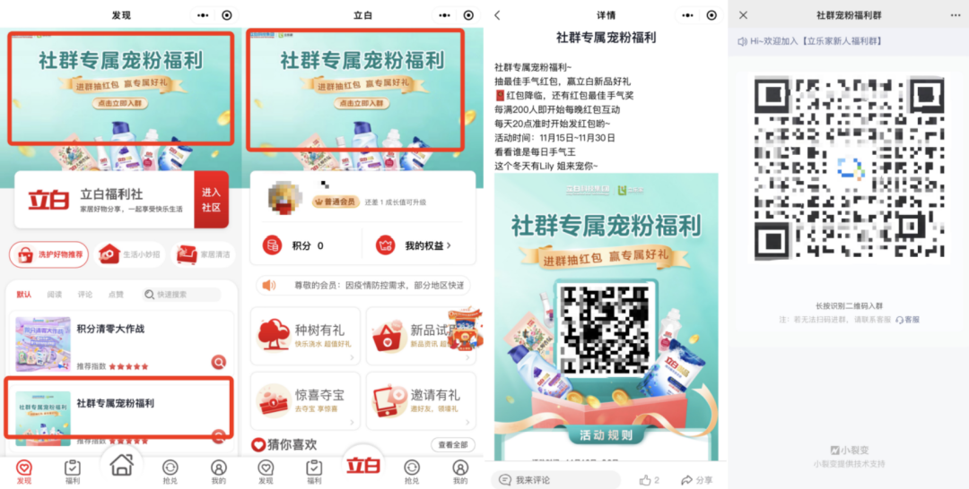 引流路徑(2):在【立白會(huì)員俱樂(lè)部】的首頁(yè)和發(fā)現(xiàn)頁(yè),有【社群專(zhuān)屬寵粉福利】海報(bào)吸引用戶點(diǎn)擊,點(diǎn)擊進(jìn)入活動(dòng)詳情頁(yè)面,保存圖片后,掃碼直接進(jìn)入新人福利群。