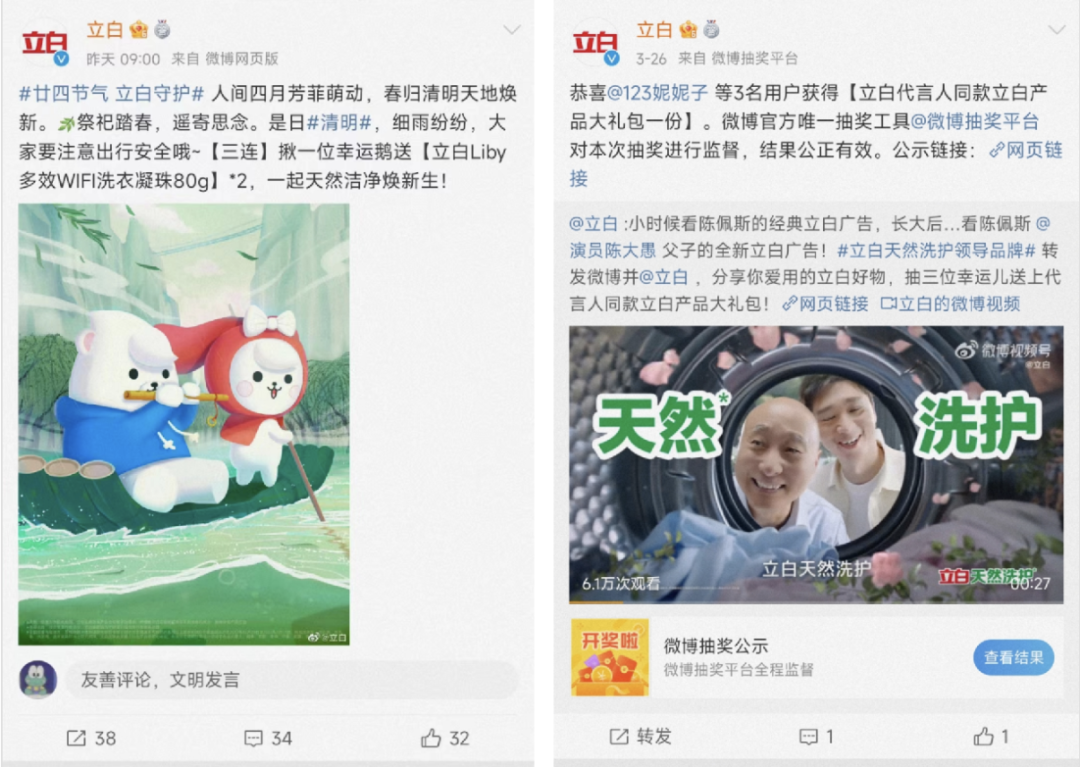立白在微博官方賬號(hào)上抽獎(jiǎng)活動(dòng)更為頻繁,一般每周都有2-3次。不同的是,有時(shí)會(huì)與其他品牌進(jìn)行聯(lián)合推廣,提升品牌曝光。