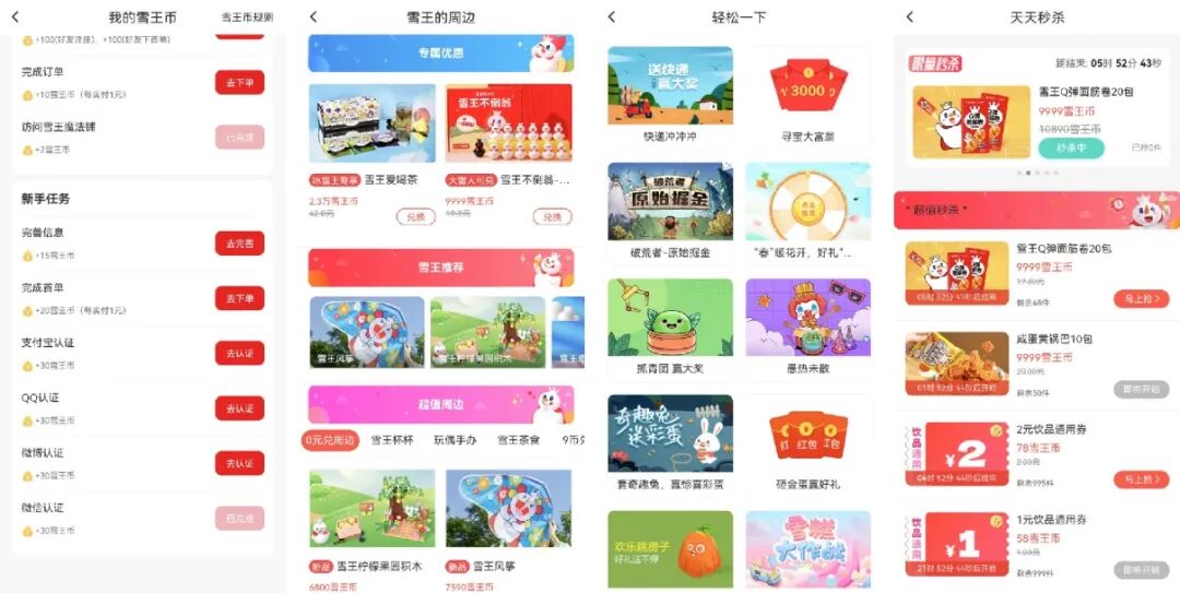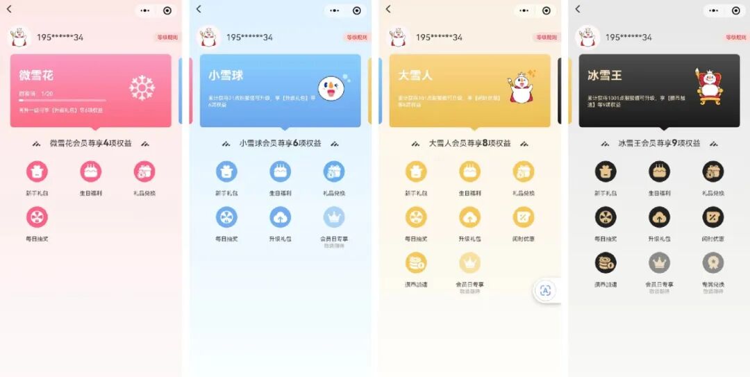 蜜雪冰城的社群運(yùn)營內(nèi)容比較單一,主要是發(fā)布社群福利、新品推薦,發(fā)布時(shí)間集中在上午9點(diǎn)和下午18點(diǎn)。這2個(gè)時(shí)間段通常是用戶的早餐時(shí)間和晚餐時(shí)間,容易產(chǎn)生消費(fèi)需求。蜜雪冰城全平臺(tái)會(huì)員數(shù)破1億,目前在微信小程序、支付寶、電商平臺(tái)等渠道設(shè)置了會(huì)員體系,通過超級(jí)用戶體系,培養(yǎng)更多擁有強(qiáng)大消費(fèi)力和忠誠度的用戶,延長用戶的生命周期。下面以小程序?yàn)槔M(jìn)行詳細(xì)拆解:成長會(huì)員分為4個(gè)等級(jí),具體要求和權(quán)益如下:微雪花(甜蜜值0-20):權(quán)益包括新手禮包、生日福利、禮品兌換、每日抽獎(jiǎng);小雪球(甜蜜值21-100):權(quán)益包括新手禮包、生日福利、禮品兌換、每日抽獎(jiǎng)、升級(jí)禮包、會(huì)員日專享;大雪人(甜蜜值101-1000):權(quán)益包括新手禮包、生日福利、禮品兌換、每日抽獎(jiǎng)、升級(jí)禮包、閑時(shí)優(yōu)惠、攢幣加速、會(huì)員日專享;冰雪王(甜蜜值1000以上):權(quán)益包括新手禮包、生日福利、禮品兌換、每日抽獎(jiǎng)、升級(jí)禮包、閑時(shí)優(yōu)惠、攢幣加速、會(huì)員日專享、專屬兌換;