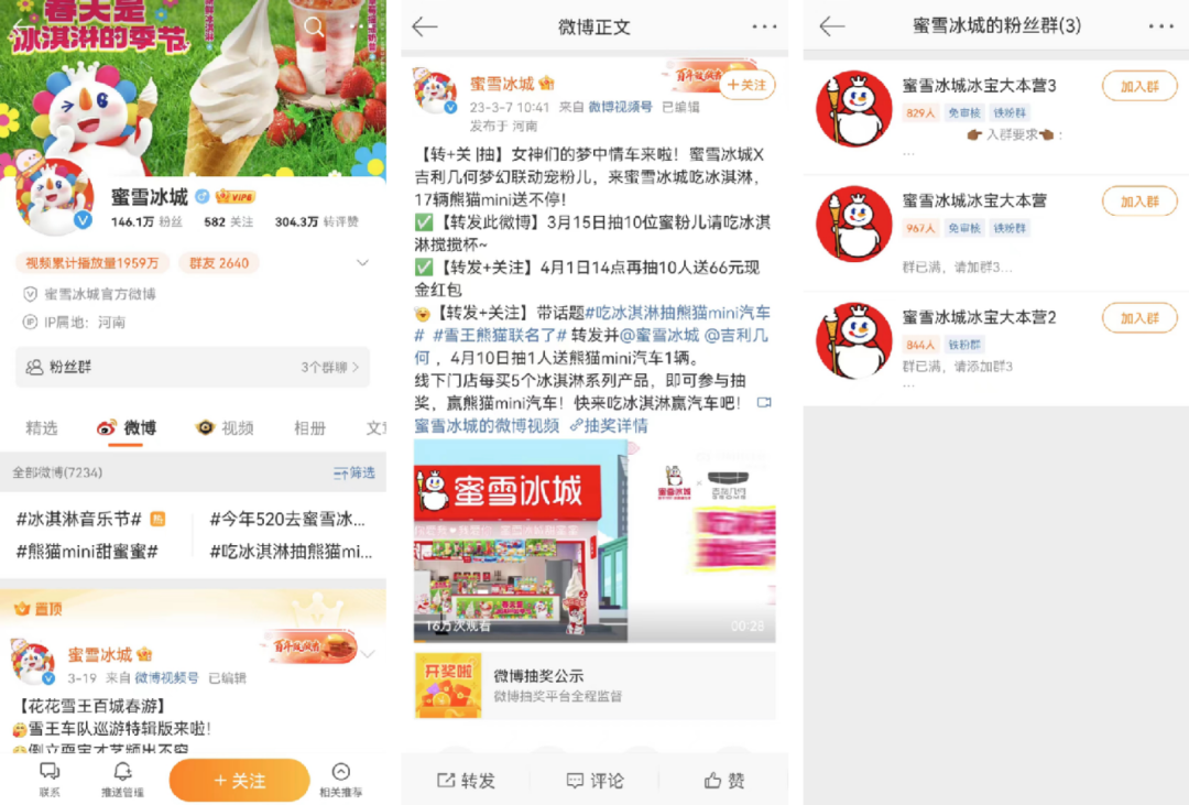 蜜雪冰城在微博有146w粉絲,轉(zhuǎn)贊評(píng)304.3w。微博主要是展示品牌合作、新品推廣、活動(dòng)宣傳等內(nèi)容。通過抽獎(jiǎng)、禮包等福利吸引用戶關(guān)注或轉(zhuǎn)發(fā),增加微博賬號(hào)的曝光量。首頁設(shè)置粉絲群的觸點(diǎn),關(guān)注賬號(hào)后可申請(qǐng)進(jìn)入。