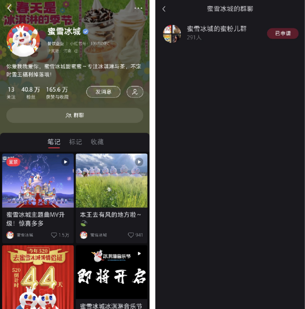 蜜雪冰城賬號(hào)有40.8w粉絲,獲贊與收藏165.6w。賬號(hào)主要是以新品推廣、活動(dòng)宣傳、雪王日記等內(nèi)容,首頁設(shè)置群聊入口,點(diǎn)擊即可申請(qǐng)加入社群。