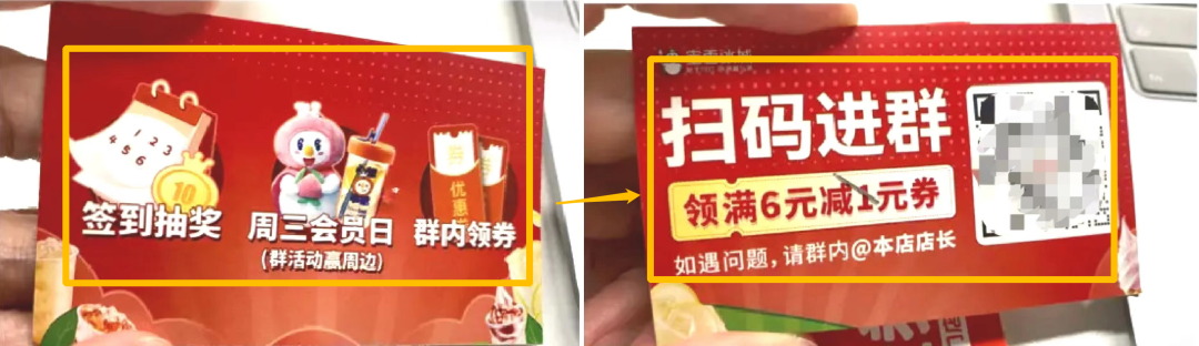 在門店大門、外玻璃墻等明顯的位置,張貼福利海報(bào)。如,以「進(jìn)群領(lǐng)滿6元減1元券」為噱頭,一方面吸引未進(jìn)店的用戶,進(jìn)店消費(fèi);另一方面,吸引用戶直接掃碼進(jìn)群,由線下引流到線上統(tǒng)一運(yùn)營。蜜雪冰城的包裹卡,以簽到抽獎(jiǎng)、周三會(huì)員日、群內(nèi)領(lǐng)券為利益點(diǎn),吸引用戶掃碼進(jìn)群。正面利益點(diǎn)明顯,放大「1元」的字樣,吸引用戶使用。背面介紹代金券的詳細(xì)使用規(guī)則,并引導(dǎo)用戶掃碼,引流到微信小程序。根據(jù)用戶的使用習(xí)慣,口味標(biāo)簽是用戶視覺停留頻次最多、停留時(shí)間最長的一面。蜜雪冰城在這一面印上二維碼,以「掃一掃,新品早知道」為噱頭吸引用戶掃碼,跳轉(zhuǎn)到公眾號(hào)頁面。關(guān)注「蜜雪冰城」公眾號(hào)后,公眾號(hào)中的自動(dòng)歡迎語,以及菜單欄,會(huì)設(shè)置官方網(wǎng)站、APP、小程序、會(huì)員等引流鏈接,用戶點(diǎn)擊后能自動(dòng)跳轉(zhuǎn)到相應(yīng)頁面。