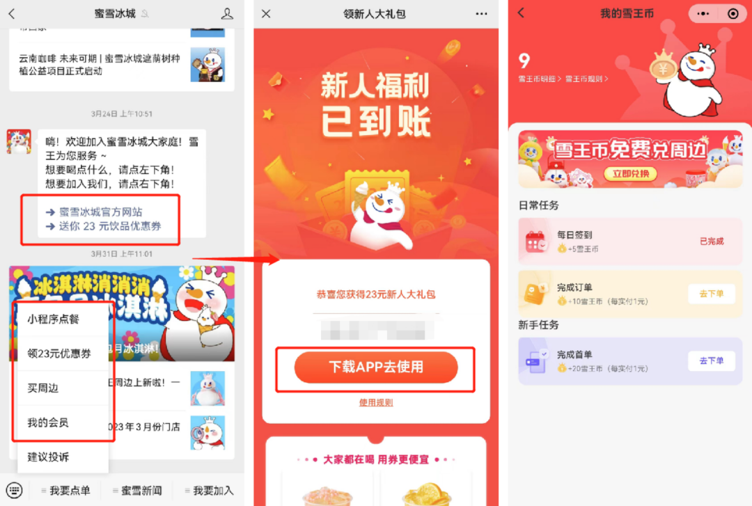 蜜雪冰城的雪王幣可通過消費(fèi)、簽到、邀請(qǐng)好友、完成任務(wù)等途徑獲取。積分可以用于兌換無門檻券、秒殺產(chǎn)品、參加積分小游戲等。目前蜜雪冰城的裂變主要在APP中展現(xiàn)。在APP首頁設(shè)置了「邀請(qǐng)有獎(jiǎng)」的入口,用戶通過新用戶的拉新注冊(cè)、下單,獲得獎(jiǎng)勵(lì)。具體規(guī)則:用戶邀請(qǐng)新用戶注冊(cè)app,可獲得10元優(yōu)惠券禮包,新用戶完成首單,可獲得5元優(yōu)惠券1張,另外還可獲得100雪王幣;被邀請(qǐng)的新用戶則可獲得23元優(yōu)惠券包。最后總結(jié)一下蜜雪冰城在私域運(yùn)營上的亮點(diǎn)和不足:1)IP運(yùn)營真實(shí)化:企微的活動(dòng)產(chǎn)品內(nèi)容和IP運(yùn)營內(nèi)容規(guī)劃合理,不會(huì)給用戶全是廣告的排斥感,也不會(huì)讓用戶遺漏掉福利活動(dòng),與用戶情感距離更貼近。2)場(chǎng)景化設(shè)計(jì)引流觸點(diǎn):通過設(shè)定不同等級(jí)的會(huì)員體系,對(duì)會(huì)員數(shù)據(jù)統(tǒng)一維護(hù)和管理,完善會(huì)員標(biāo)簽、進(jìn)行客戶細(xì)分,在營銷上“區(qū)別對(duì)待”,精準(zhǔn)觸達(dá),高效運(yùn)營和洞察會(huì)員。3)社群玩法單一:社群內(nèi)容玩法比較少,內(nèi)容推薦頻次也比較低,會(huì)導(dǎo)致品牌存在感不足,產(chǎn)品的價(jià)值點(diǎn)也不容易吸引到用戶。