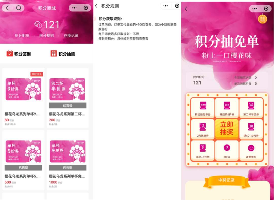另外,還專門添加積分抽獎,每天5次,每次5積分,獎品也主要是以券為主,不僅有趣味性,還提升了積分的價值。