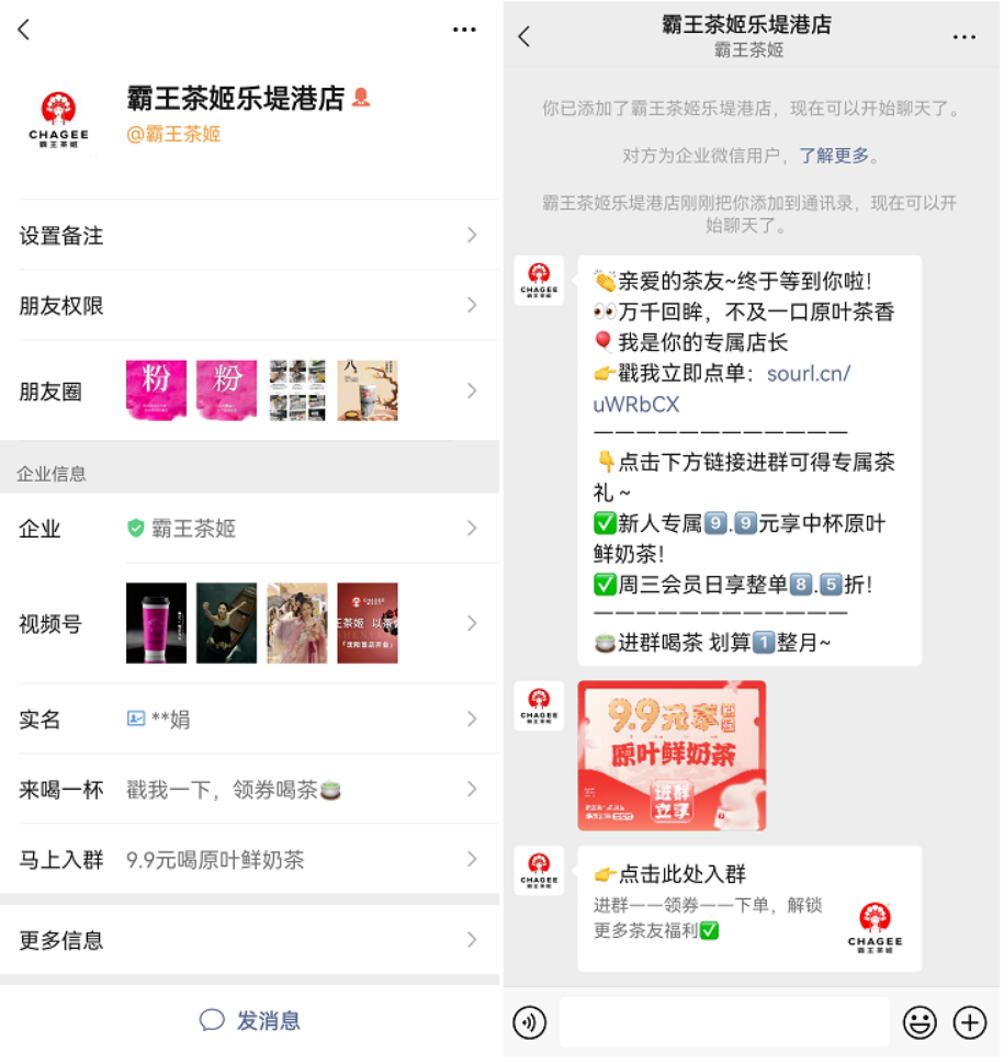 添加企微的用戶多數(shù)都是因為活動福利而來,而霸王茶姬把優(yōu)惠放在群內(nèi),雖然把路徑變長,體驗感降低,但是能讓用戶添加企微的同時也能入群。