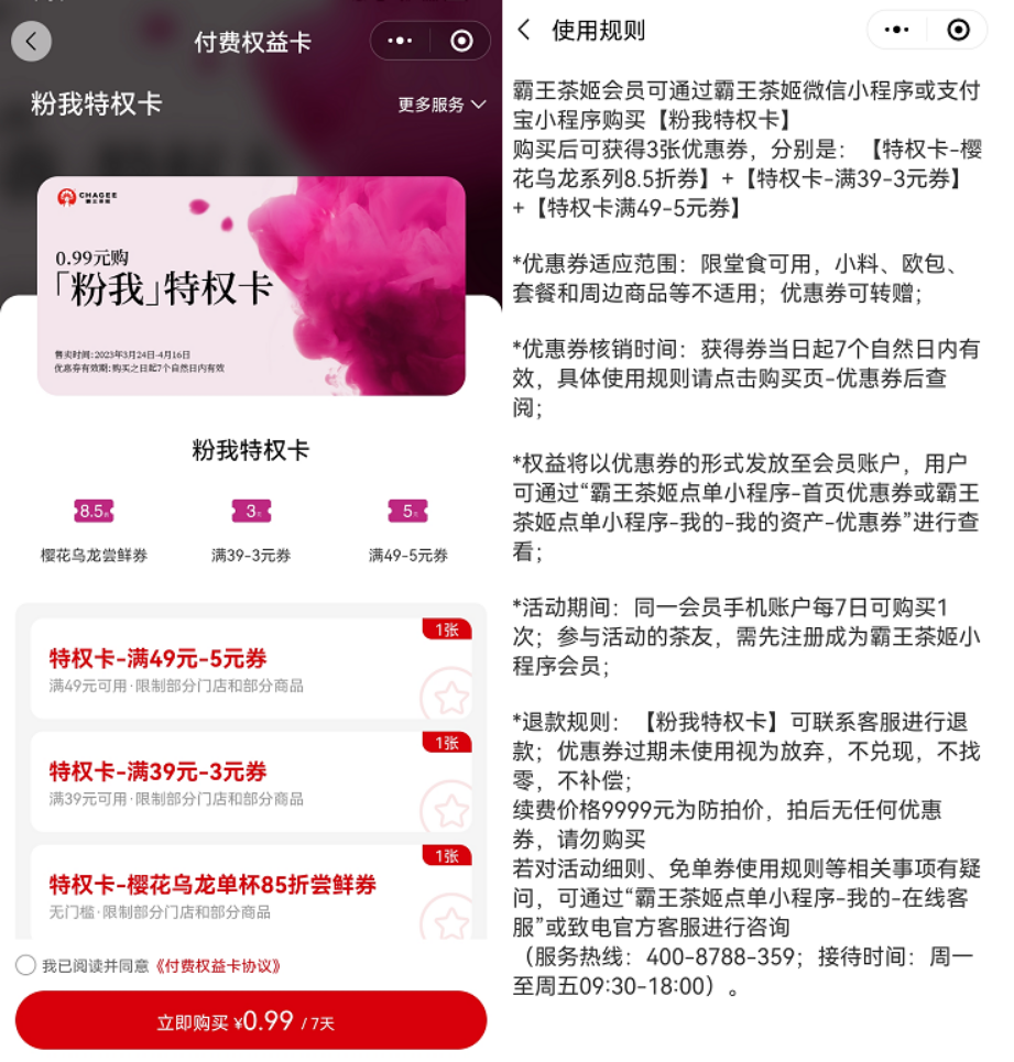 霸王茶姬可0.99元購買一張「粉我特權(quán)卡」,包含一張滿49元減5元券、滿39減3元券,以及櫻花烏龍單杯85折嘗鮮券。