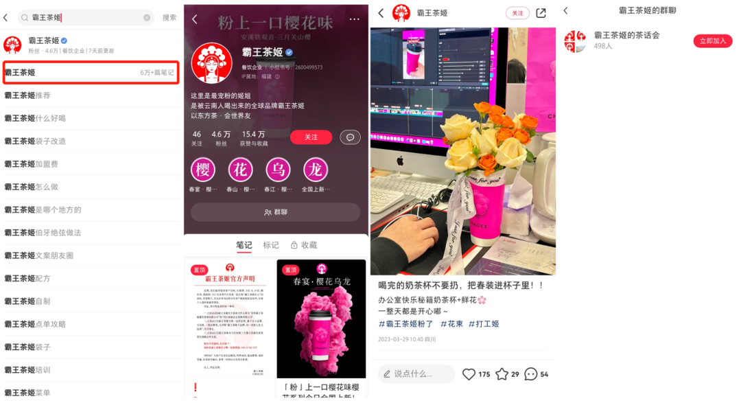 霸王茶姬在小紅書共有6w+筆記,粉絲4.6w+,同時也建立了粉絲群。筆記內(nèi)容以品宣、產(chǎn)品種草、新品造勢、有獎互動以及活動為主。