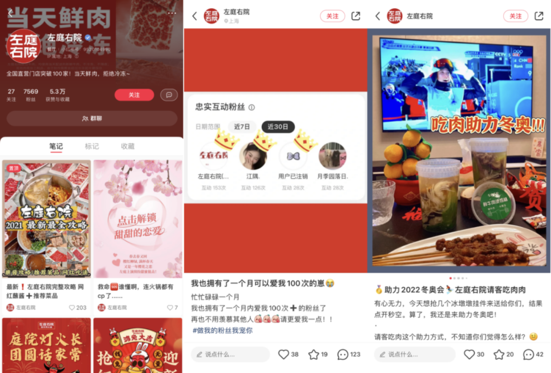 左庭右院在小紅書有7569粉絲,轉(zhuǎn)贊評5.3w。賬號主要是進行品牌形象宣傳、福利活動推廣、有獎互動、美食推薦等內(nèi)容。