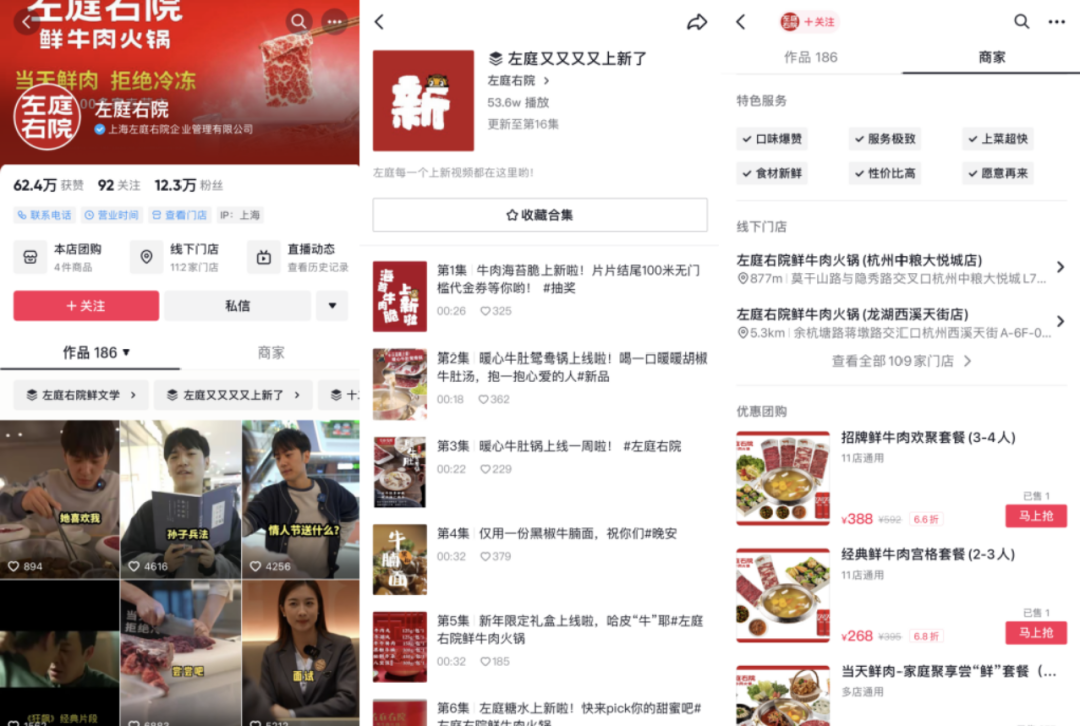 另外,左庭右院首頁有團購和線下門店的觸點,店家即可跳轉(zhuǎn)到相關(guān)頁面,同時官方也會不定時進行直播,引導(dǎo)用戶產(chǎn)生轉(zhuǎn)化。
