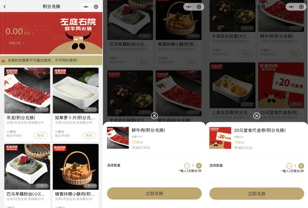 左庭右院主要通過消費(消費20元=1積分)獲取積分,積分可用于兌換菜品、代金券和商城券,不管是實物還是虛擬物,有效期都在30天。