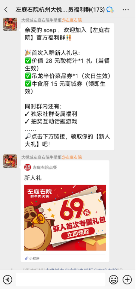 社群作為私域中最常見也最有效之一的場景,而左庭右院的社群以門店群模式運營,以我添加的某個社群為例: