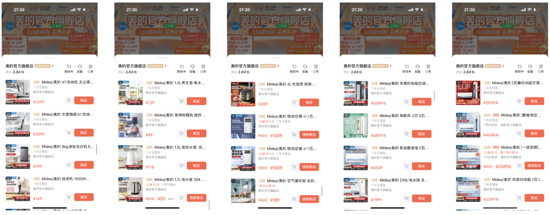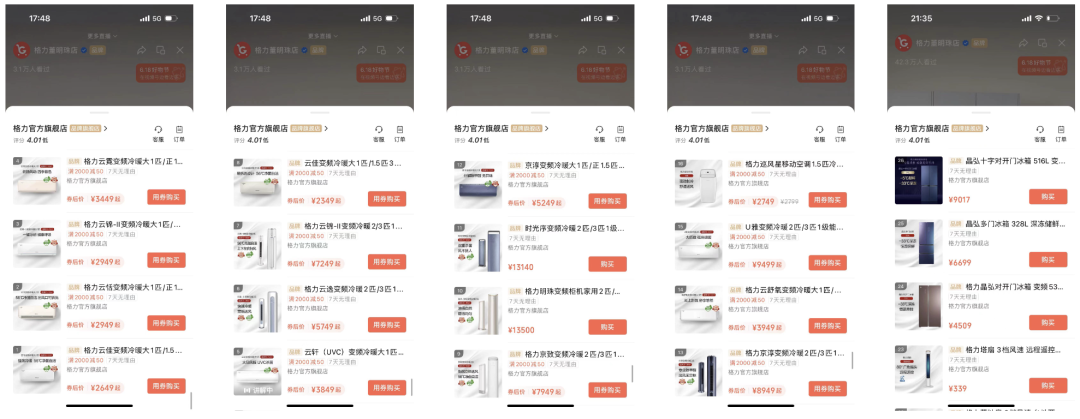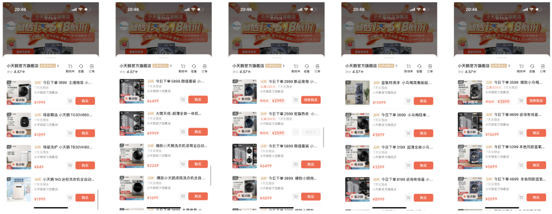 對比來看,在直播間購物貨品的呈現(xiàn)上都各有亮點。格力、美的通過減扣券的設(shè)置,用戶在下單時點擊“用券購買”、“領(lǐng)券購買”按鈕,增加了一份參與大促活動的優(yōu)惠感;而小天鵝則通過在標(biāo)題中增加“今日下單+價格”的文案,給用戶一種限時提醒,促使盡快完成下單抉擇。