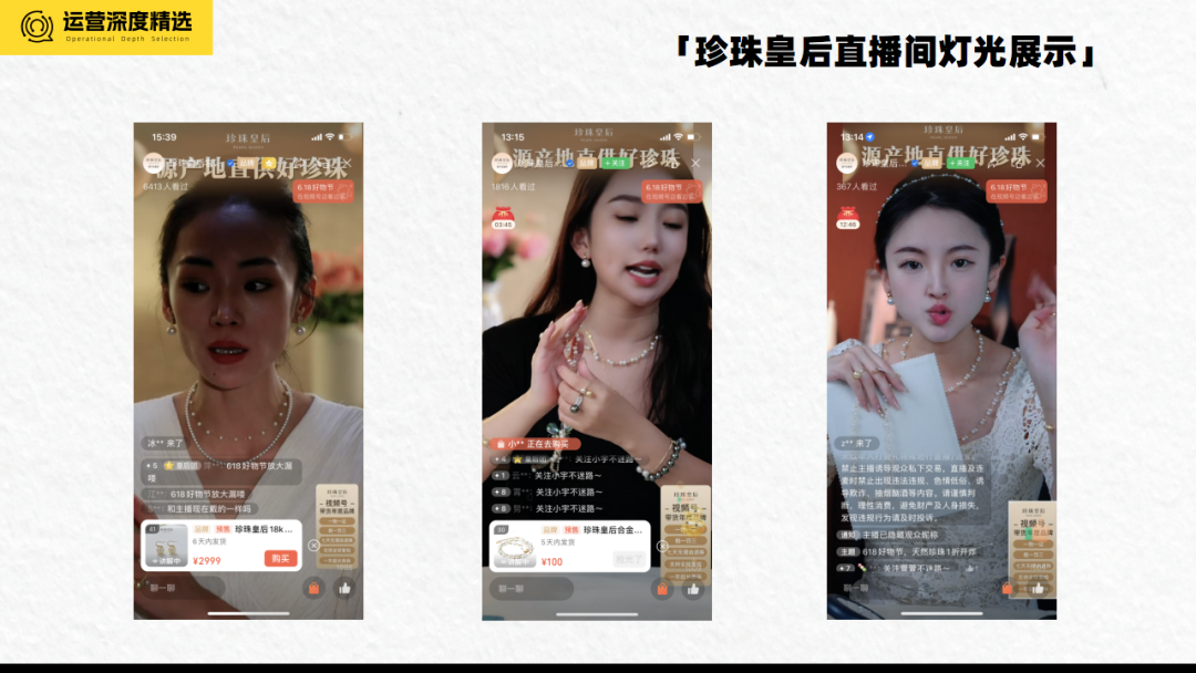 可以看到,珍珠皇后直播間的布光都較為柔和,有時(shí)會(huì)為了展示珠寶的光感,刻意調(diào)得比較暗,但是又不至于暗到看不見產(chǎn)品的樣子,光的明亮度的把握,其實(shí)暗藏“玄機(jī)”。