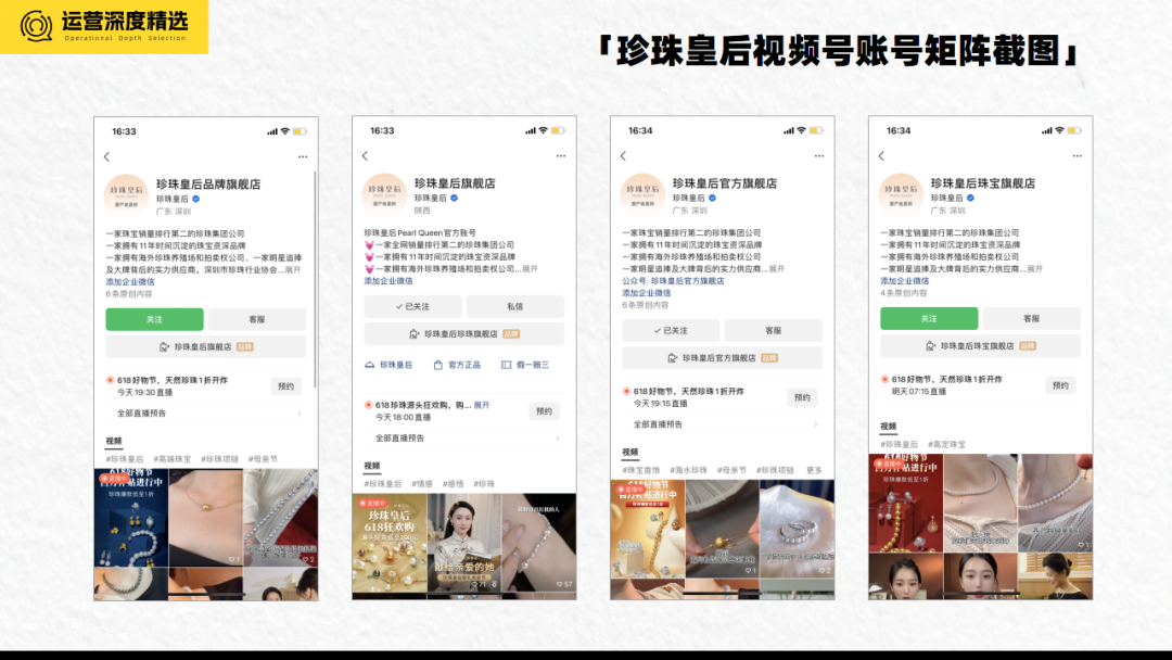 我們發(fā)現(xiàn),除了這四個(gè)視頻號(hào)賬號(hào)之外,珍珠皇后還有其它一些認(rèn)證的賬號(hào),包括珍珠皇后輕奢旗艦店等,以及未認(rèn)證的幾個(gè)賬號(hào)??梢钥闯?,珍珠皇后在視頻號(hào)上采取的是矩陣化的布局思維。目前是四個(gè)賬號(hào)輪番直播,矩陣化布局的方式增加了品牌觸達(dá)用戶的概率,而大力確實(shí)能夠出奇跡:無論你什么時(shí)候刷珠寶類的直播間,都能刷到珍珠皇后。