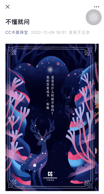 此篇推文將原本長篇文章內(nèi)容濃縮成一張張圖片,并以書本的形式來呈現(xiàn),需要用戶點擊之后切換圖片查看。在圖片的設(shè)計上以扁平風(fēng)格為主,整體背景是暗色系,能更好突出產(chǎn)品圖片,讓用戶在閱讀過程中快速將目光鎖定到珠寶產(chǎn)品。