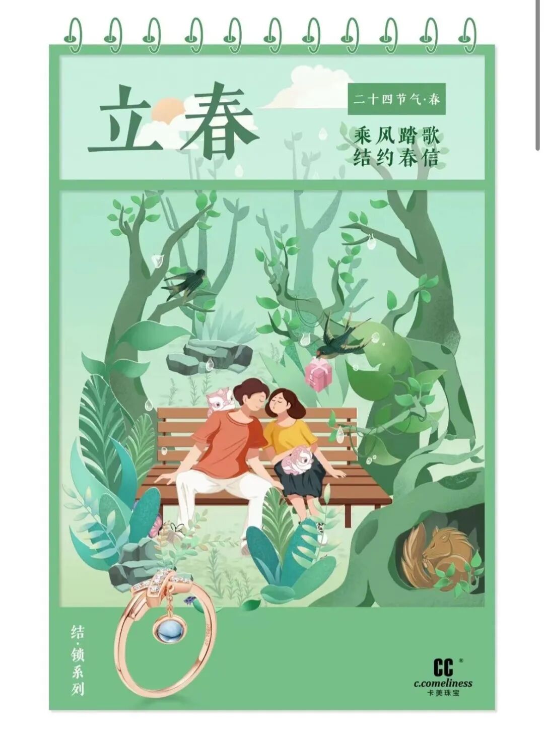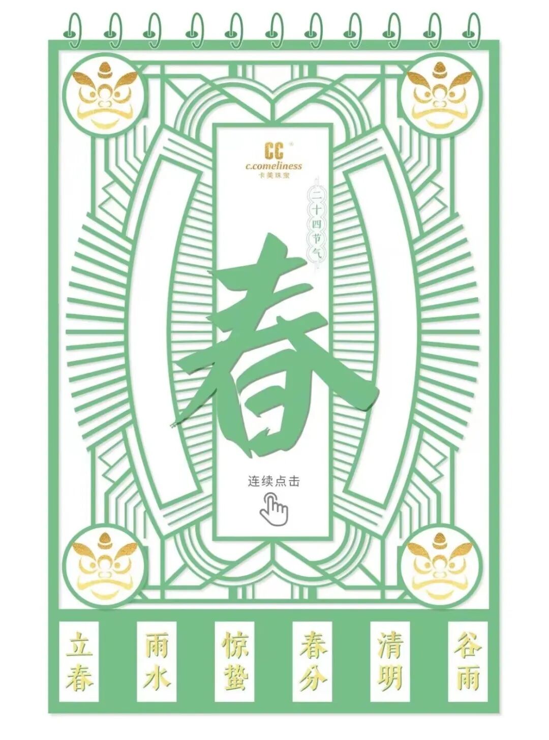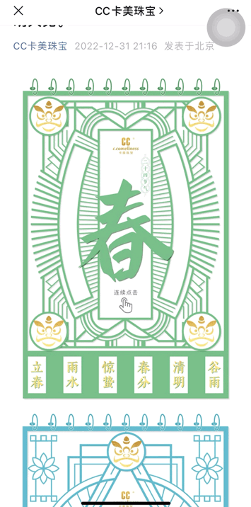 這篇推文是以二十四節(jié)氣為主題,以春夏秋冬為分界點,每一個節(jié)氣海報圖則對應(yīng)一個珠寶產(chǎn)品。通過點擊切換節(jié)氣日歷的想法來做年度產(chǎn)品總結(jié),既展示了產(chǎn)品,又與年末主題相契合,與傳統(tǒng)的年度總結(jié)文章形式相比較而言構(gòu)思更巧妙。