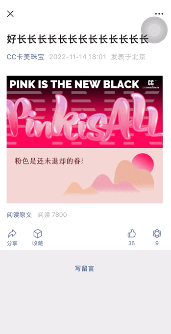 一看到這篇推文中的效果,我想大家應(yīng)該都不陌生了吧,沒錯,這就是《GQ紅了》爆款推文中的同款效果。在這篇文章中,以“粉色是什么”為主題,加上多款動態(tài)的文字圖片進(jìn)行組合展示,對粉色的概念做了進(jìn)一步解釋,一步步地引導(dǎo)用戶往下閱讀推文,再在文章末尾處放上自己的新產(chǎn)品進(jìn)行宣傳推廣,與直接展示產(chǎn)品圖片相比,讓用戶更易接受,創(chuàng)意十足。