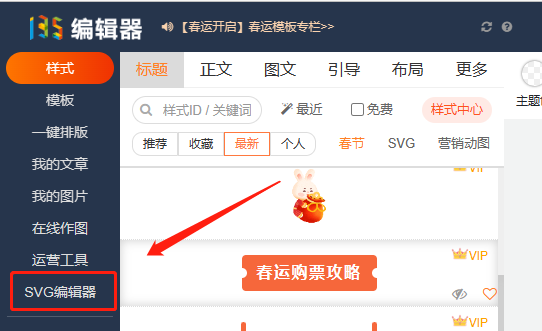 在135編輯器首頁,選擇左側(cè)菜單欄【SVG編輯器】進(jìn)入。