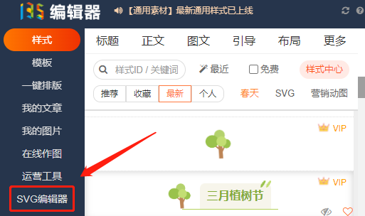 在135編輯器首頁(yè),選擇左側(cè)菜單欄【SVG編輯器】進(jìn)入。