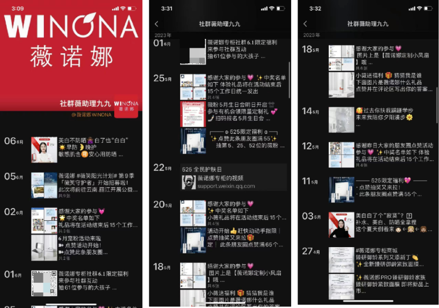 薇諾娜的社群有固定板塊的內(nèi)容,包括每日抽獎、促銷活動、護膚知識科普,直播預告等。