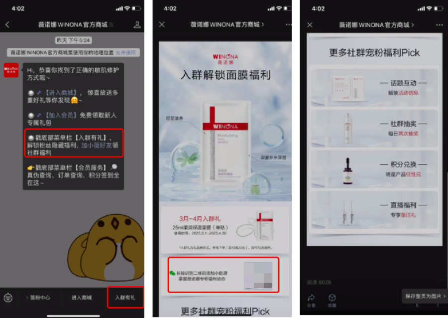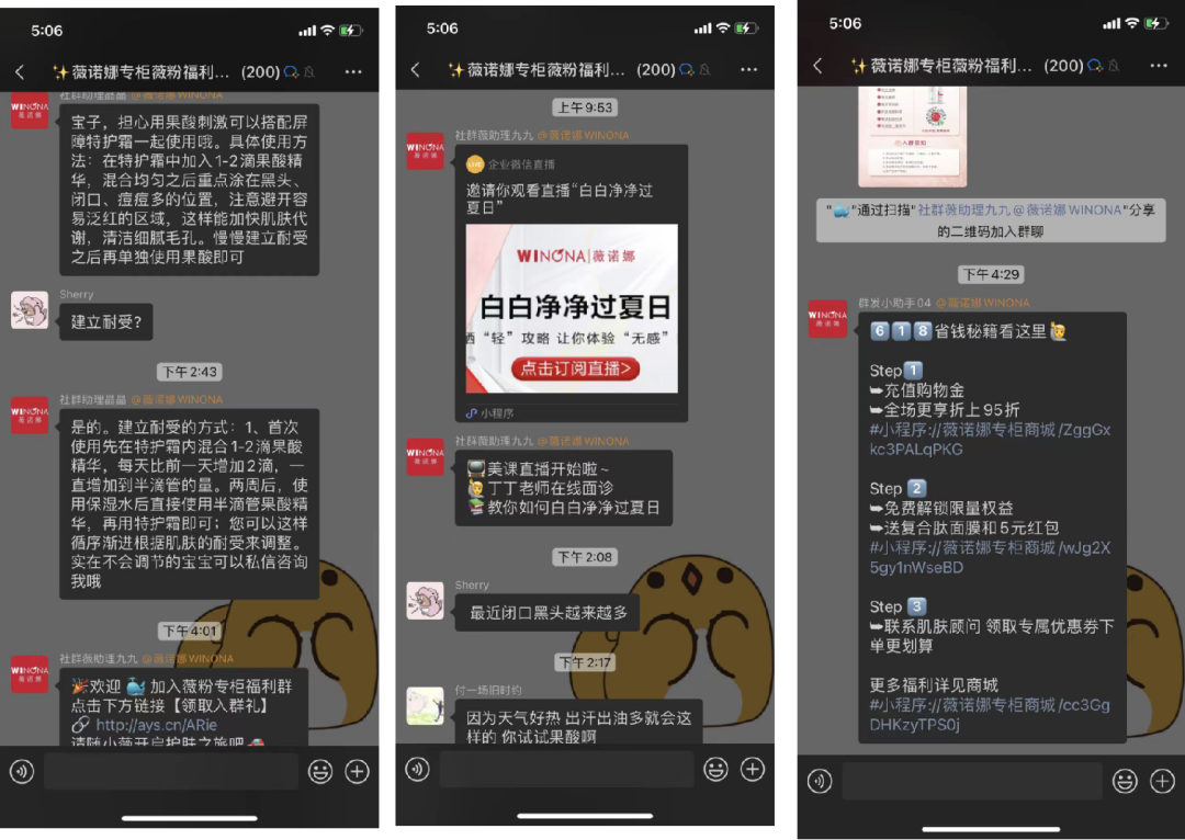 除此之外,薇諾娜的客服人員還會積極回答用戶的提問,給出相應(yīng)的護膚建議,所以社群的整體留存率、活躍度較高。