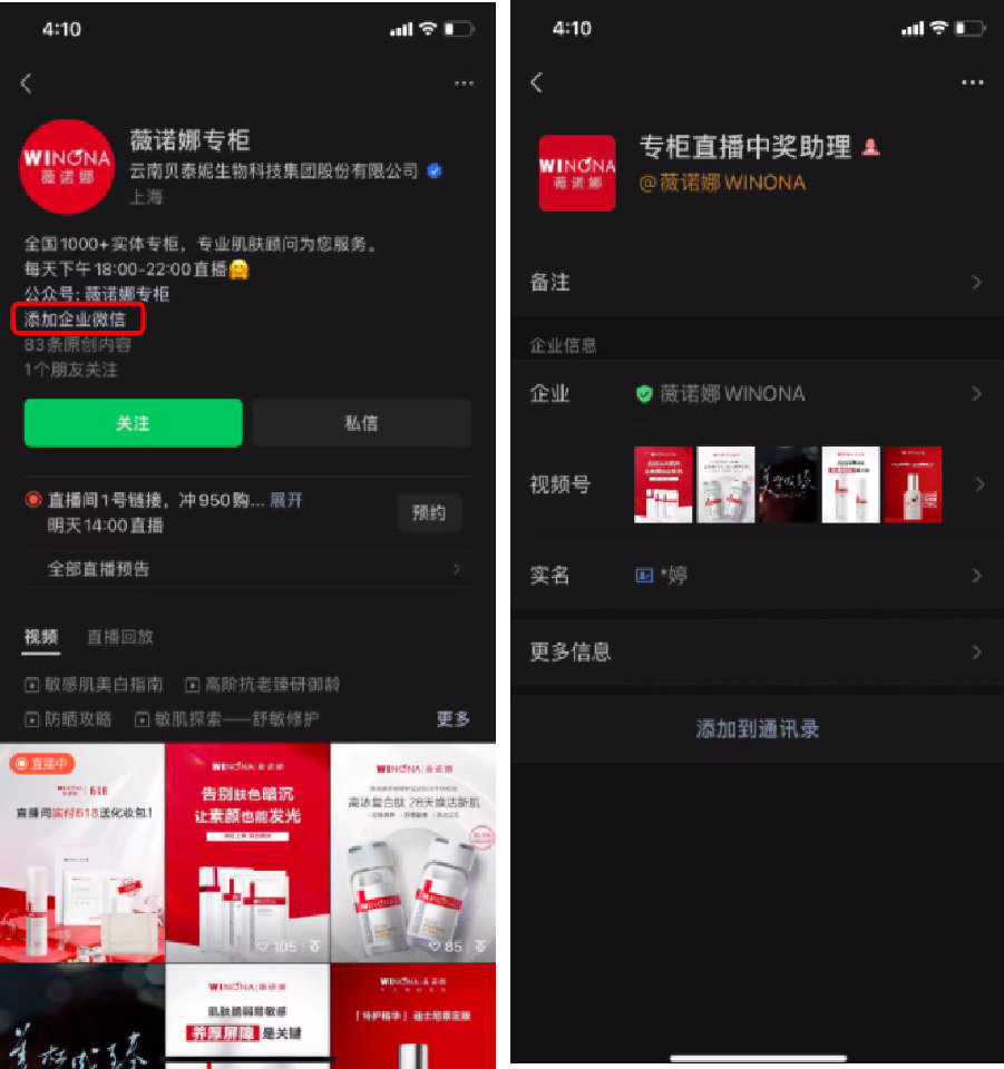 「薇諾娜WINONA官方商城」公眾號在打招呼語跟菜單欄中都設(shè)置了私域社群的引流入口。