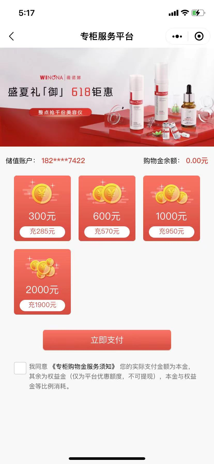薇諾娜以充值返現(xiàn)的方式,鼓勵用戶充值,充值金額越高返現(xiàn)越多。具體:充285得300,充值570得600,充950得1000,充1900得2000。